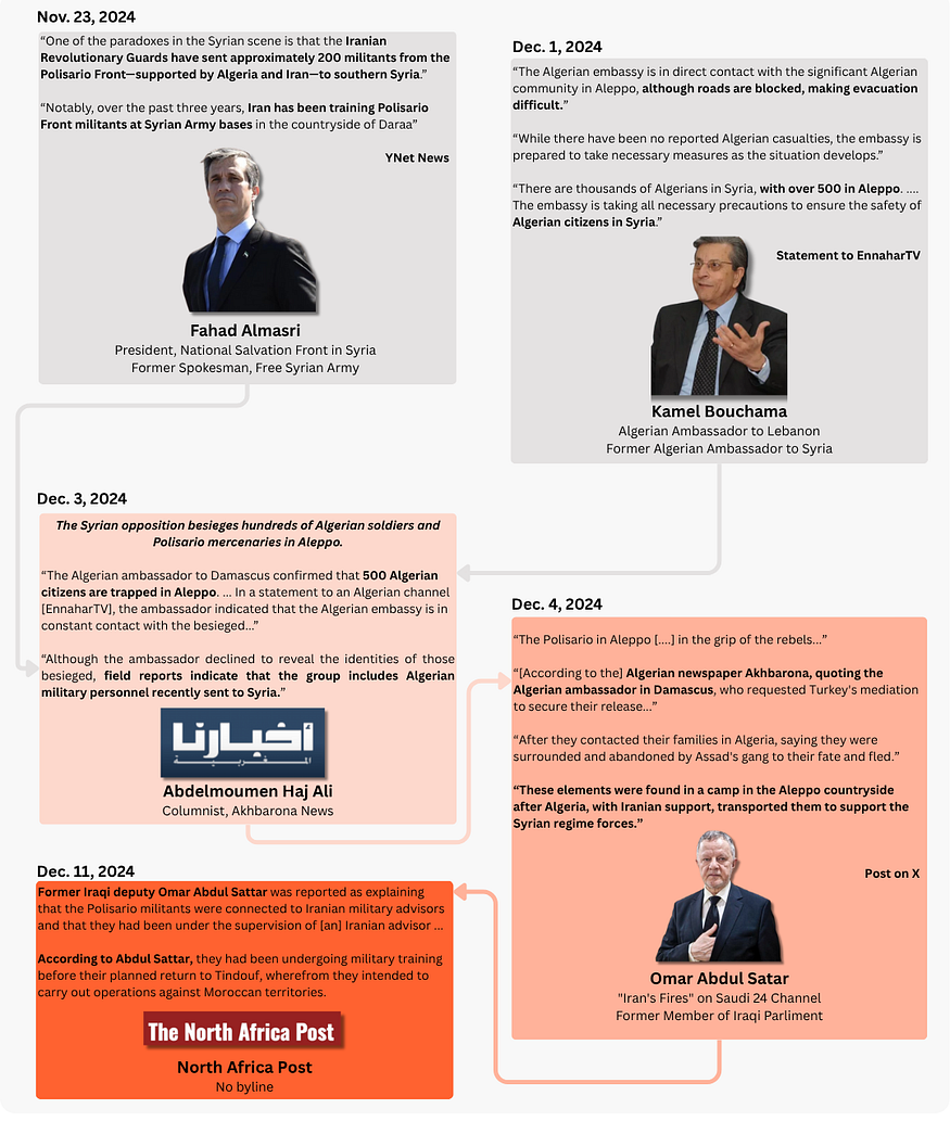 Despite the only actual basis for the claim of Iran-backed, Hezbollah trained Algerian fighters captured in Aleppo being a pre-offensive opinion piece by a Syrian expat, this continued misrepresentation of statements, claims, and sources meant that by late December 2024 it appeared that at least two large newspapers (the North Africa Post and Akbarona) and three high profile diplomatic sources (Almasri, Sattar, and Bouchama) all confirmed the same demonstrably false report as true.